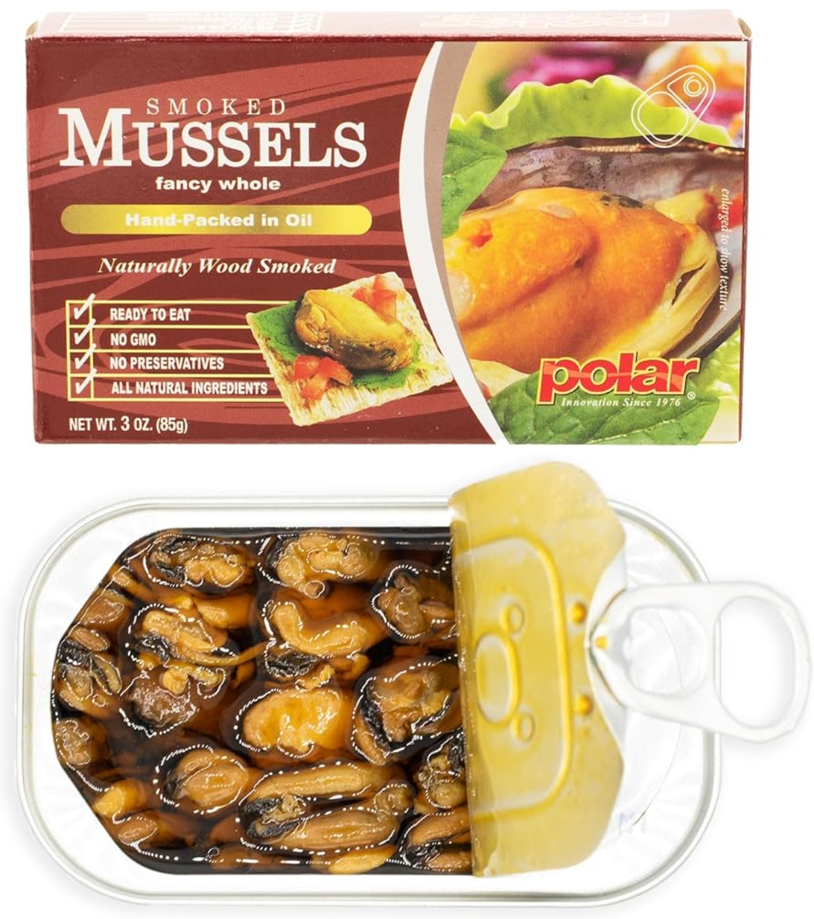 "Get hooked on our POLAR Smoked MUSSELS! These juicy, flavorful mussels are sure to satisfy your seafood cravings. Perfect for snacking, salads, or pasta dishes, they're a quick and easy way to add a taste of the ocean to any meal. Warning: may cause mermaid envy (but it's worth it)!"