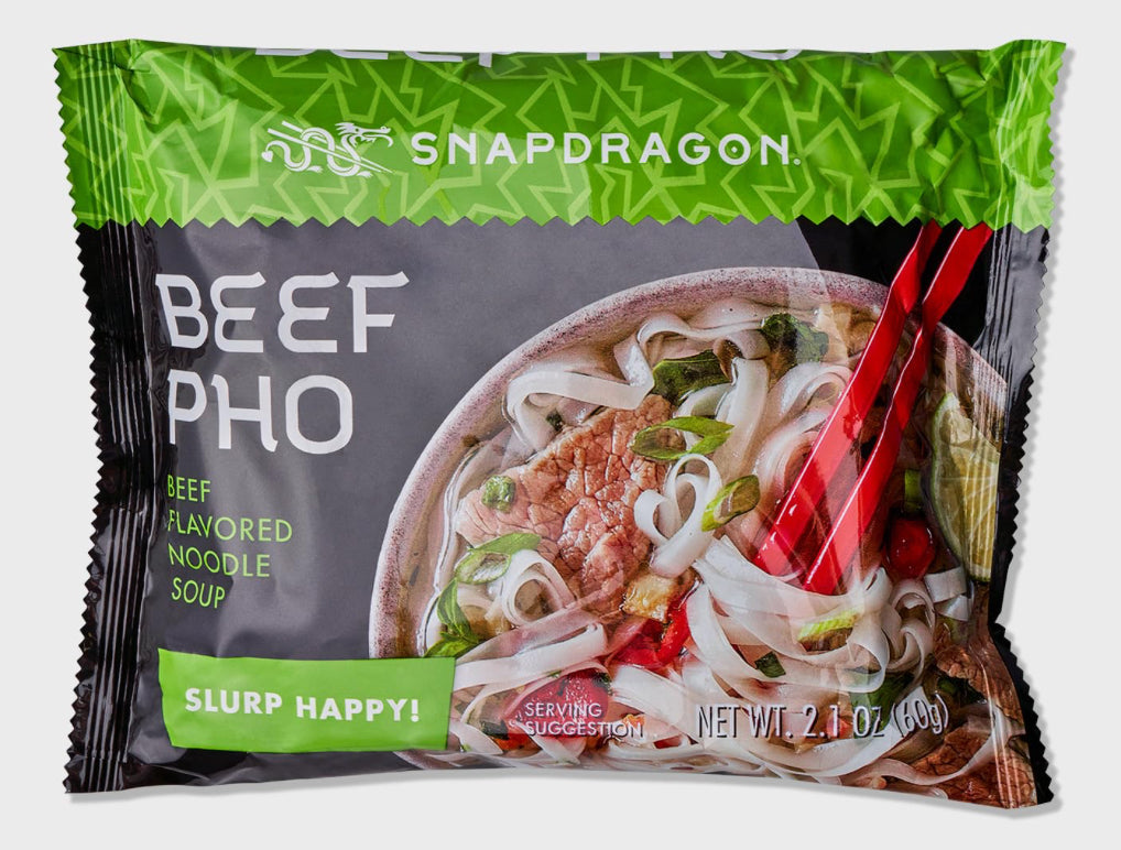 SNAPDRAGON BEEF PHO, the perfect blend of beef and traditional Vietnamese spices in one convenient 2.1 ounce pack. Enjoy nourishing, flavorful pho in minutes. (No need to bee shy about your love for pho, we won't judge.)